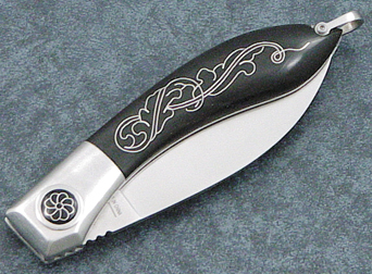 "Starship," with its revolutionary locking system, double bevel and unique one-hand opening and closing capability, is designer Paul Chen's most outstanding creation yet. So outstanding, it won Blade Magazineís coveted "Most Innovative Imported Design" award for 1999. Features open frame construction, pocket clip, ATS-34 blade steel, titanium handle and mother of pearl inlays."Starship" is supplied, with a lubricator, in a polished hardwood case and each piece comes with a 21"x15" "Starship" collector print by Tiger Wang.