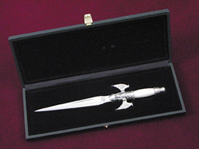 드라큘라성 미니 검은 악귀를 쫒기를 원하는 사람들이 사용하기에 매우 우아하고 아름다운 단검 형태의 Letter Opener이다.박쥐날개 모양의 손잡이와 칼날은 이상적인 비율로 하였으며, 흰색 손잡이(0001-B)와 까만색 손잡이(0001-N)두 종류에 고급스런 선물용 케이스에 담았다. 가격:50,000원